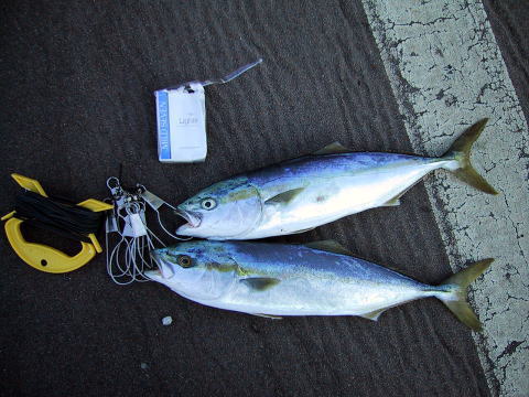 | 2002/10/14 14:00 | 外海はかなりの濁りがありました。テトラの上よりキャスト開始。10分ほどで初あたり、しかしのらず。 30分ほどして、小アタリ、即合わせ、釣れてきたのは40cmほどのサワラ。。。朝はイナダが上がったそうだが、それ以降は サワラのみ。友人も隣で朝からキャスト。3尾の釣果でした。釣れるイナダも小型が多い。 |