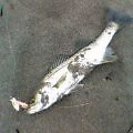 | 2003/6/29 20:00 | 某所 | かなり浅いポイントだが魚影に期待し開始。 開始間もなくショートバイト連発。 これはいけると踏んで粘ってみることに。 20分位経ったところでようやくサスケFS赤金にヒット! うーんかなり良い引き! 50は間違いないなと思いつつ寄せに入りタモ入れ。 なんと、60オーバーの「ボラ」くんでした。 スレだったので引くわけだわな。。。 その後はアタリも無くなり撤収(TOT |