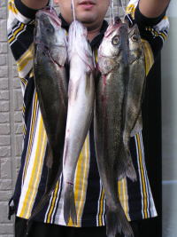 | 2003/11/7 20:00 | 某所 | 久しぶりの湾内ランガン。 いろいろ場所を変えてみたものの全く気配無し。 ベイトの数もあまり無かった。 湾内では引き潮時にあまりいい思いをしたことがなかったので、潮が変わったところで見切った。 その後ポイント移動。 風がかなり強かったので飛距離を考えタイドスリムをセレクト。このルアーはマジでぶっ飛びでス。 4~5投目でコツコツ。。。ゴン! キター!! ヒットの瞬間からシーバスと確認! 潮の流れが速く魚が大きく感じました。 ネットインした魚体は45cm(R)のギンピカシーバス。 エラにフックが刺さっていたのでちょっと心配でしたが元気に泳いで行きました~ 感謝×感謝。 30分後に40Cm(R)追加して終了。 ホントカメラを持っていかないと釣れるんだよな。トホホ。 ![]() |