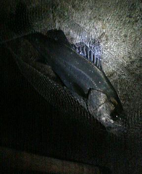 月明かりの中わずかなヨレを探しルアーのチューンドK-TEN(チャート)を打ち込む。 数箇所回ったところで待望のヒット!