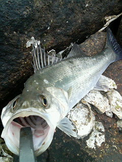 1投目からあたりがでる。 数投するとヒット! 40cmほどのシーバス。 昼間でも釣れるもんですね。